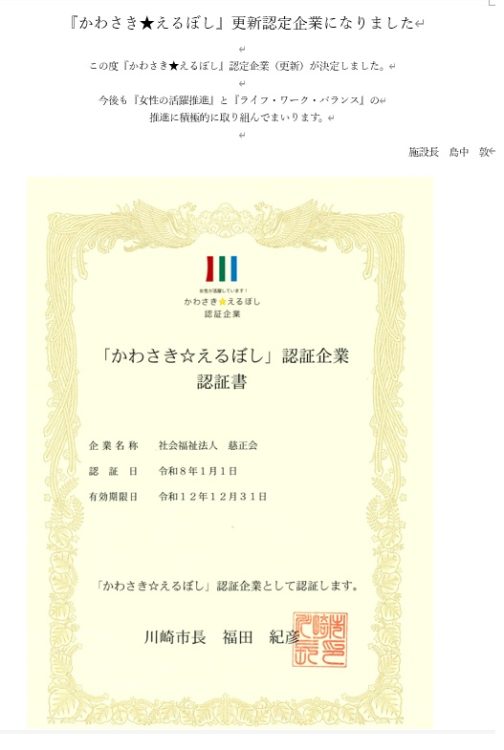 「かわさき健幸福寿プロジェクト」は川崎市で、高齢者の自立支援に向けた質の高いケアを評価する仕組みの構築を目指して開始されたプロジェクトです。 「要介護度」「ADL」等の改善・維持が評価対象となり、質の高いケアを提供する事業所が認証されます。第8期は金賞を頂きました。